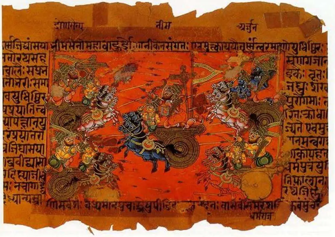 《摩诃婆罗多》史诗中记载的俱卢之战(Kurukshetra Sky Battle)的手绘插图。这场战斗发生在俱卢之战的俱卢族(Kauravas)和般度族(Pandavas)之间。图片来源:维基共享资源。