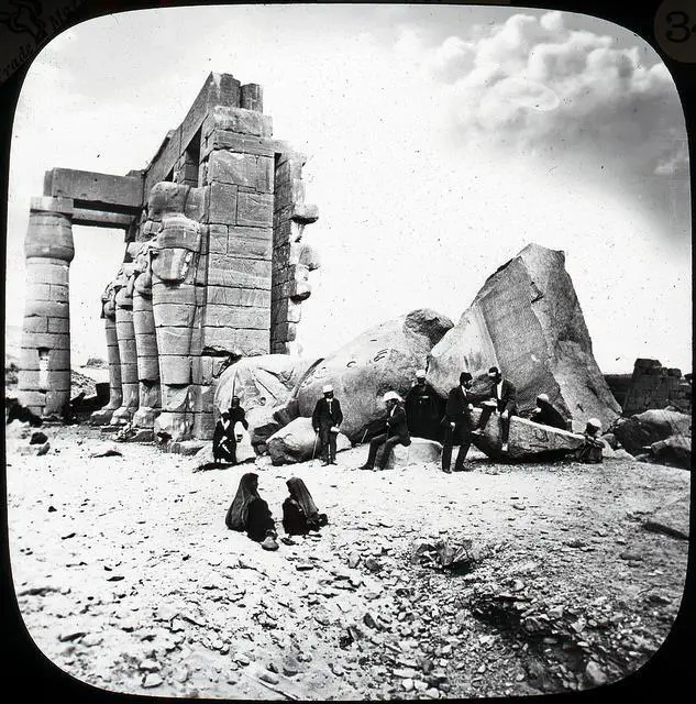 在这张照片中,您可以看到门农巨像的侧板,门农巨像位于阿蒙霍特普三世陵庙(又称科姆·埃尔·赫坦)遗址中,是该陵庙仅存的建筑之一。照片拍摄于1900年左右。