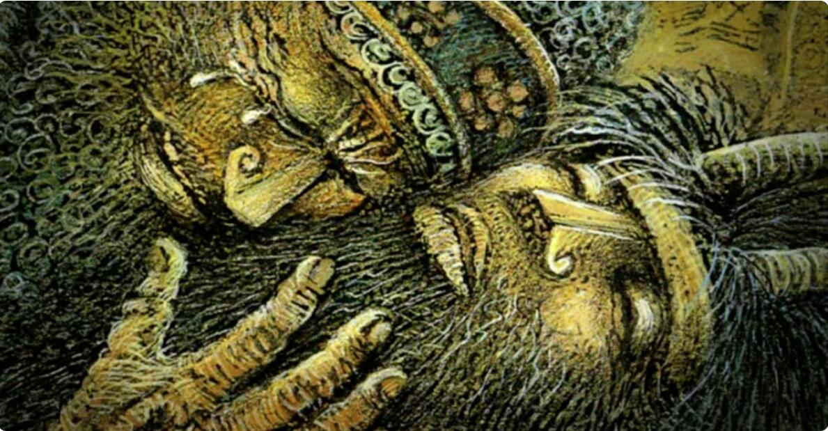 就在Enkidu转身回头的时候,突然这个洪巴巴就出现在他面前,一把抓住Enkidu,把他提起来大喊,你们是谁,竟敢来到我的地盘。你看起来像我的敌人,我要当着你的面,撕开你的喉咙,把你的肉喂食山中野兽。